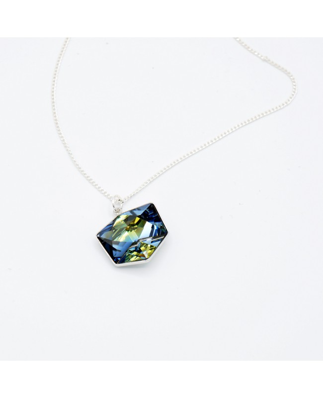 Ce pendentif mesure moins d'1 cm d'épaisseur mais les reflets de la lumière donne l'impression d'avoir un cube tout en profondeur. Le petit plus? Les reflets bleu-vert qui lui donnent encore plus de profondeur. Ce pendentif est monté sur une chaîne en argent.