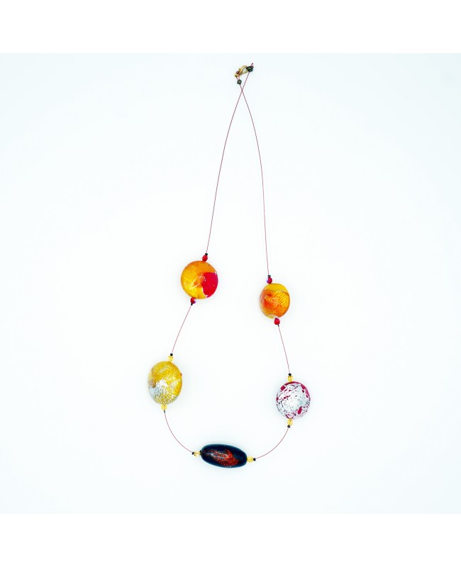 Création artisanale entièrement conçue dans notre atelier. Les perles principales sont en argile polymère et formées à la main. La perle centrale est ovale, de couleur noir pailleté avec du orange. Au milieu du orange, des reflets métalliques. Les perles sur le côté ont une forme de toupies. Elles sont orange, jaune et rouge. De la feuille d'argent vient apporter de la brillance et des reflets aux perles. De chaque côté, de petites perles en cristal de Swarovski reflètent le reflet de la lumière pour apporter encore plus de brillance et de sophistication. L'ensemble est fixé sur un fil câblé rouge et se termine par un fermoir doré.