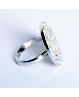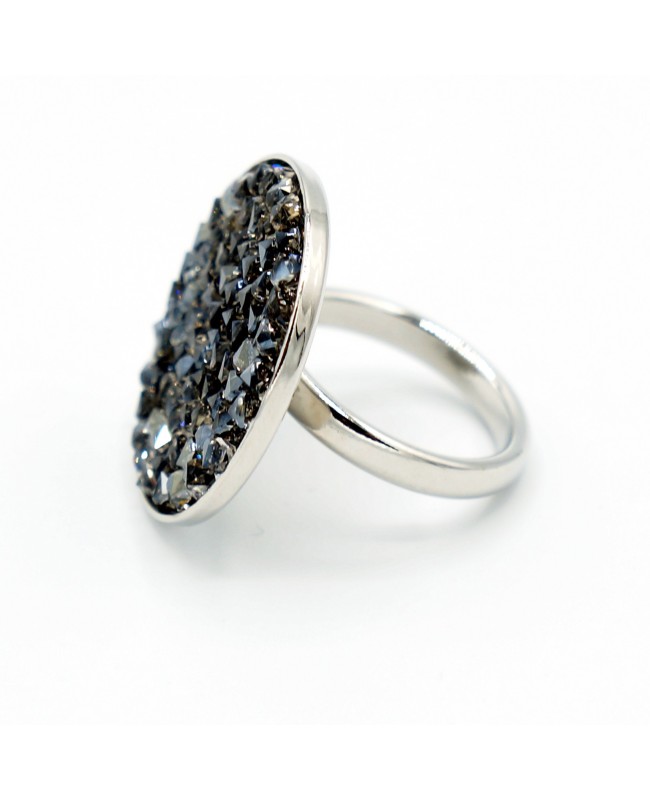 Avec son diamètre de 25 mm, cette bague, montée à la main dans notre atelier, répondra aux attentes des plus exigeantes. Pourquoi? Tout simplement parce que la partie supérieure est constituée de toupies en cristal Autrichien. Noires avec des reflets gris, elles révèlent toute leur beauté à la lumière. Elles sont légèrement transparentes et ont des reflets noirs et gris en fonction de la lumière. Le support de la bague est argenté et ajustable. Cette bague s'adaptera donc parfaitement à la taille de votre doigt.