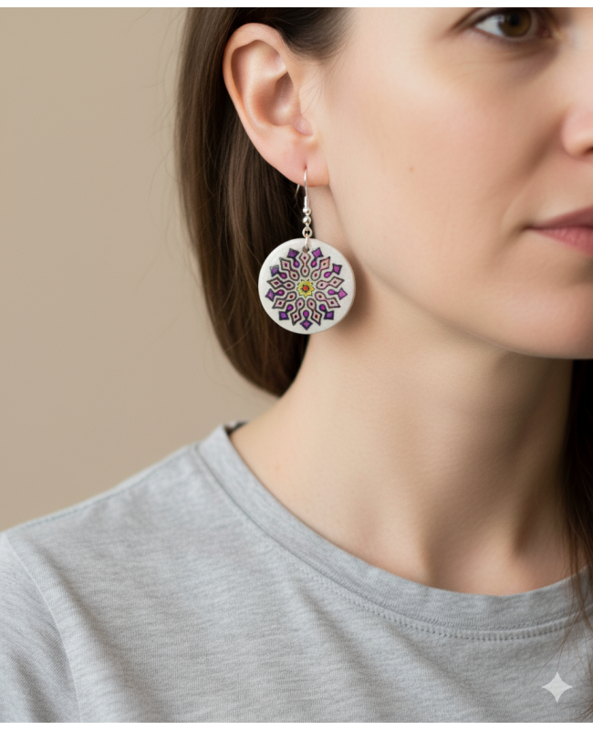 Un nouveau modèle mandala avec des tons de violet, rose et jaune. D'une longueur totale de 4,5 cm, la base ronde de ces boucles d'oreilles a été conçue dans notre atelier à partir d'argile polymère. Le motif a été entièrement colorisé à la main par nos soins. Nous avons ajouté une couche de résine pour protéger le motif. Alors, prête à faire un nouveau voyage en Asie?