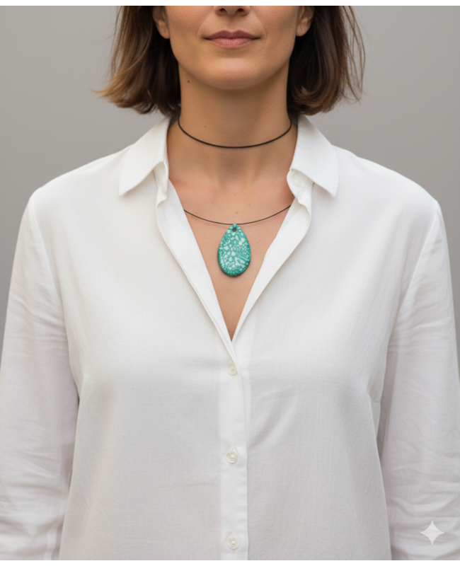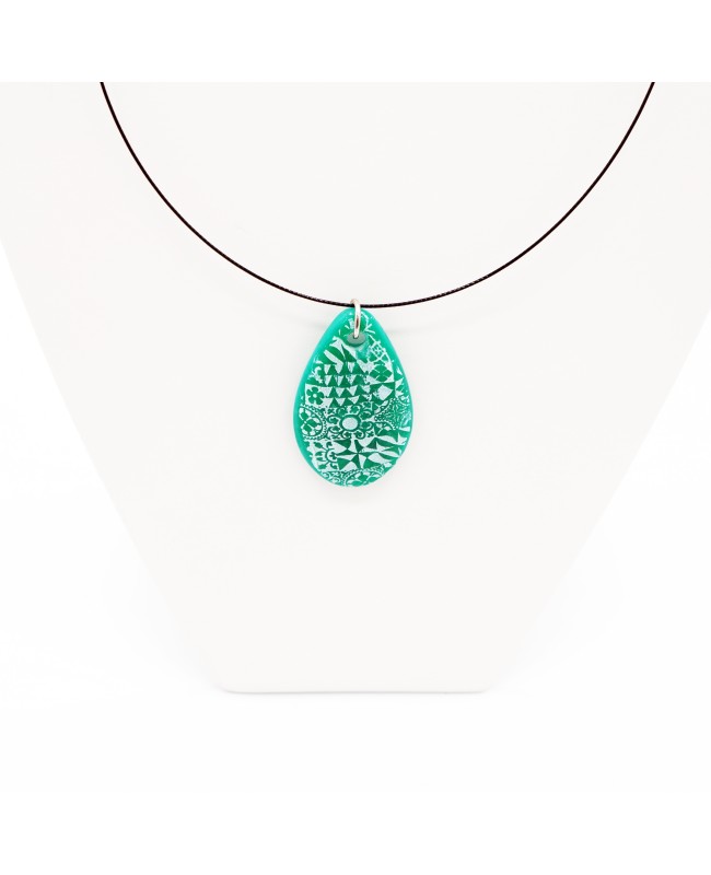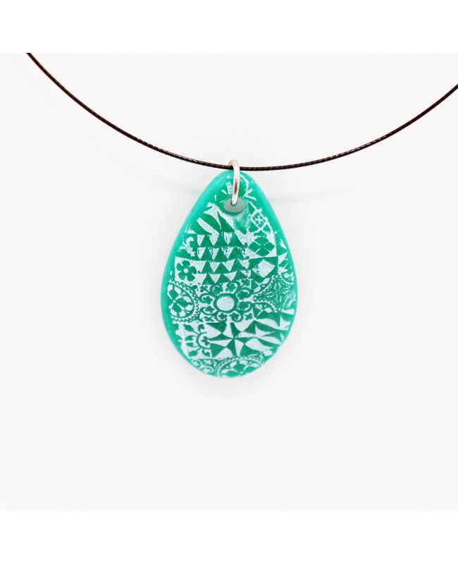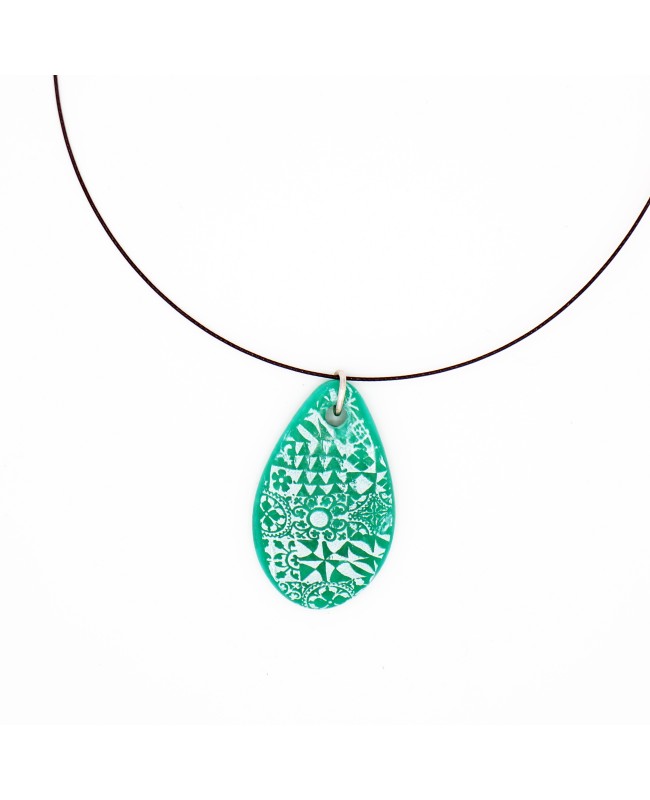Un petit air de vacances souffle avec ce pendentif vert aux motifs azulejos. De la forme d'une goutte, ce pendentif vert vous invite à un petit voyage au Portugal avec ses motifs qui rappellent les azulejos. Il se porte ras-le-cou et peut-être assorti d'une bague.