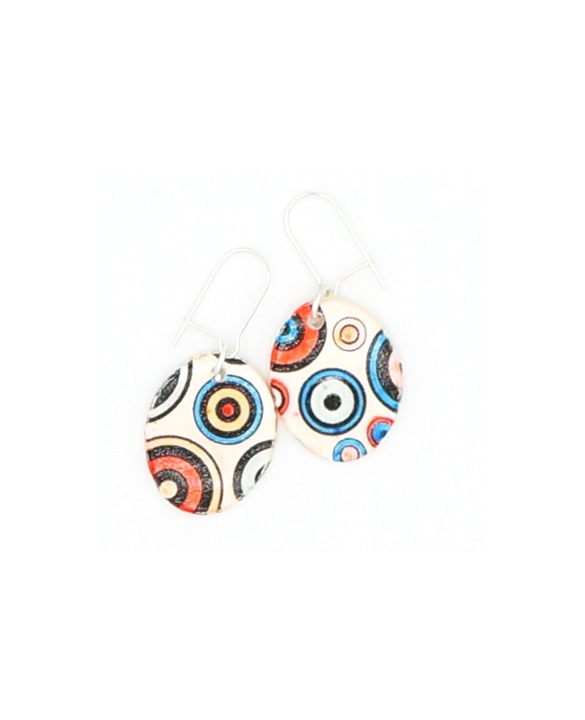 Pour affirmer votre personnalité, rien de mieux que ces boucles d'oreilles entièrement réalisées à la main. Les lentilles supérieures ont été réalisées dans notre atelier à partir d'argile polymère sur laquelle nous avons ajouté un motif noir. Les cercles concentriques ont ensuite été colorés à la main. Le côté multicolore apporte une pointe de modernité à l'ensemble. Ces boucles d'oreilles se terminent par un support en métal argenté. L'ensemble mesure 4 cm dans sa totalité.