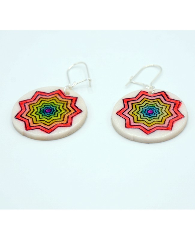 Un nouveau modèle de boucles d'oreilles rondes avec des des étoiles multicolores. D'une longueur totale de 4,5 cm, la base ronde de ces boucles d'oreilles a été conçue dans notre atelier à partir d'argile polymère. Le motif avec un effet d'optique a été entièrement coloré à la main par nos soins.
