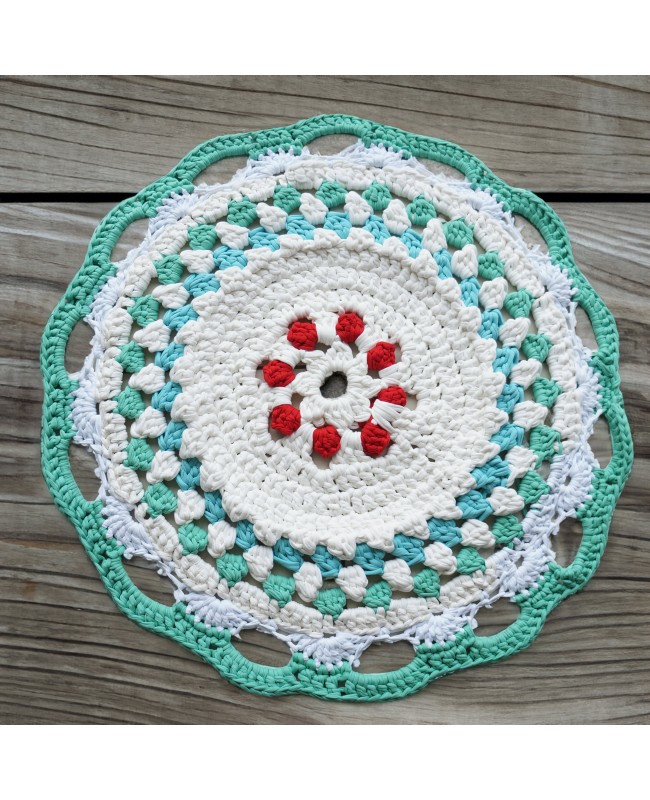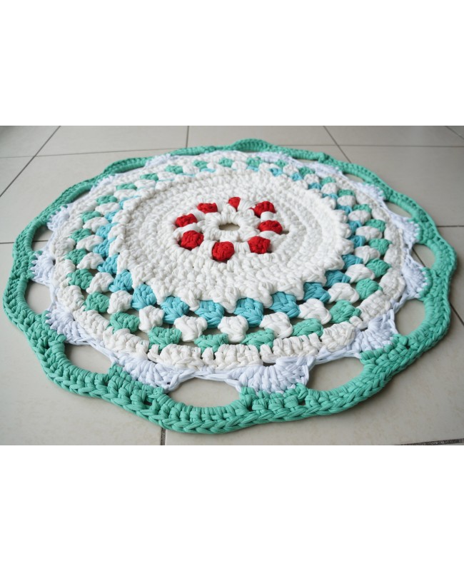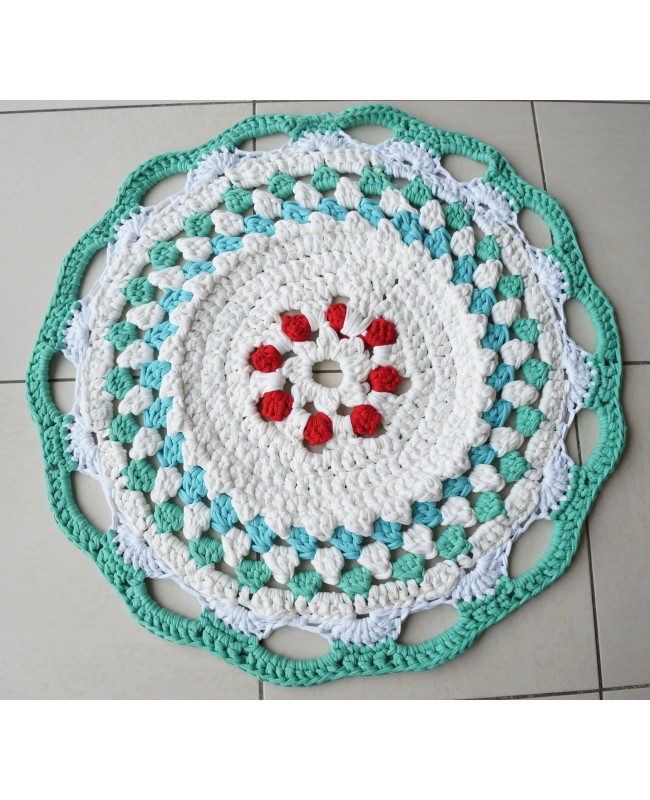 Découvrez notre magnifique tapis rond au crochet, une œuvre artisanale unique qui illuminera votre espace de vie. Ce tapis rouge, blanc et turquoise, en forme de mandala, d'un diamètre de 78 cm, est une création artisanale faite dans notre atelier et confectionnée avec soin à partir de coton recyclé.
