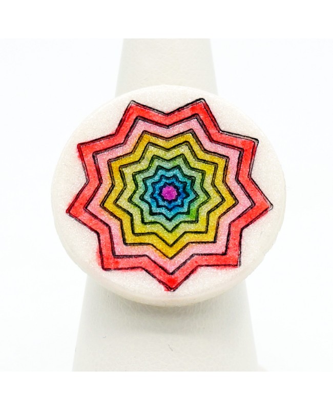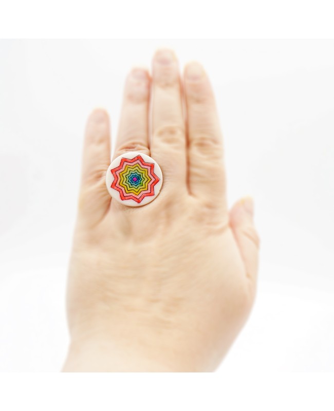 Cette bague fantaisie est une création 100% originale et fait-main. L'étoile multicolore en son centre apporte de la couleur et de l'originalité à l'ensemble. La partie supérieure a un diamètre de 2,7 cm et est en argile polymère/ L'anneau est ajustable.