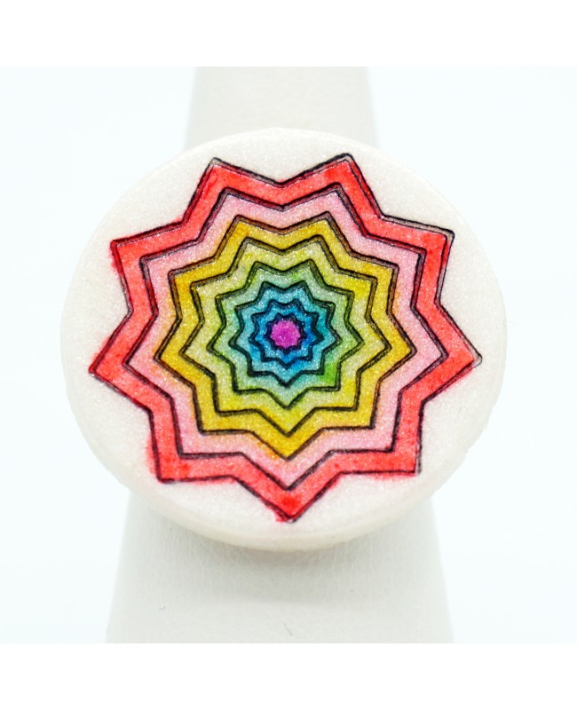 Une nouvelle bague réglable avec un cabochon en argile polymère fait son entrée sur ce site internet avec ce bijou fantaisie qui a été réalisé par nos soins. Sur une base en argile polymère blanche légèrement pailletée, nous avons ajouté un motif d'étoiles que nous avons pas la suite coloré avec des encres à l'alcool. Cette bague est multicolore et se décline tel un arc-en-ciel du violet au rouge. Ce cabochon a ensuite été fixé sur un support de bague ajustable afin que vous puissiez adapter la taille de cette bague à votre doigt. Le résultat est simple, léger mais efficace avec ces couleurs vives qui vous apporteront calme, sérénité mais surtout ... bonne humeur!