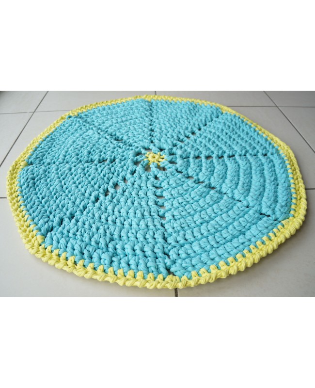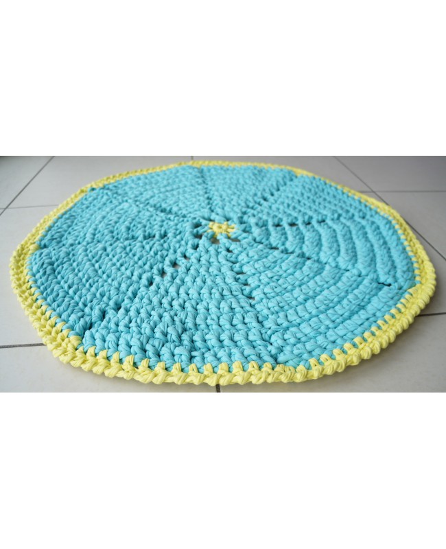 Découvrez notre magnifique tapis rond ajouré réalisé au crochet. Ce tapis jaune et turquoise, d'un diamètre de 66 cm, est une création artisanale faite dans notre atelier et confectionnée avec soin à partir de coton recyclé.