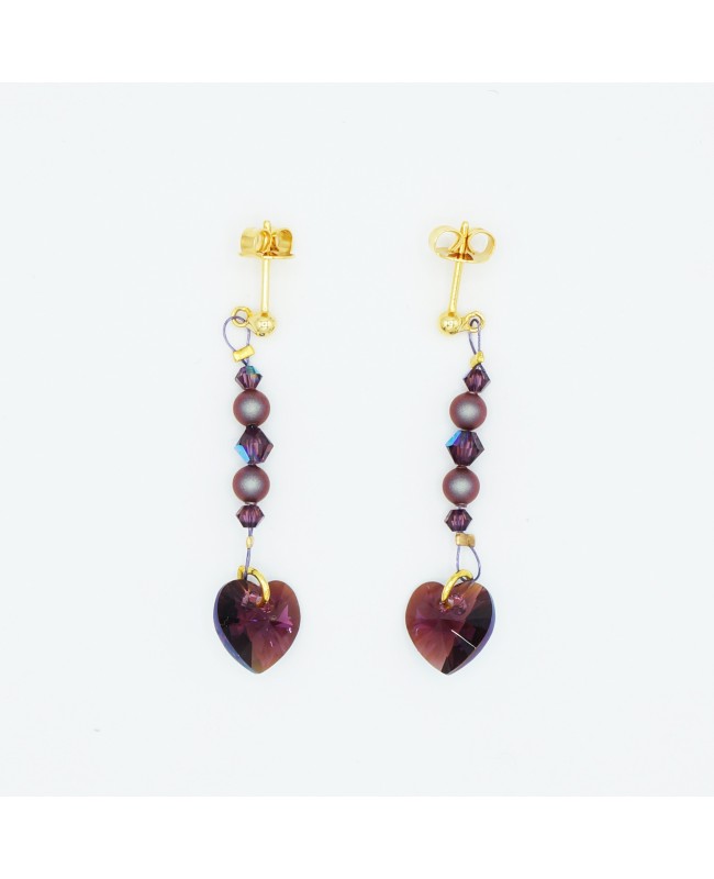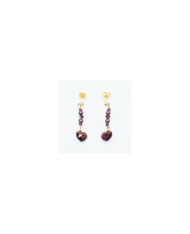 Ces boucles d'oreilles vieux rose, avec des perles et des cœurs en cristal, sont montées su un support doré. Elles ont une longueur totale de 4,5 cm de longueur.
