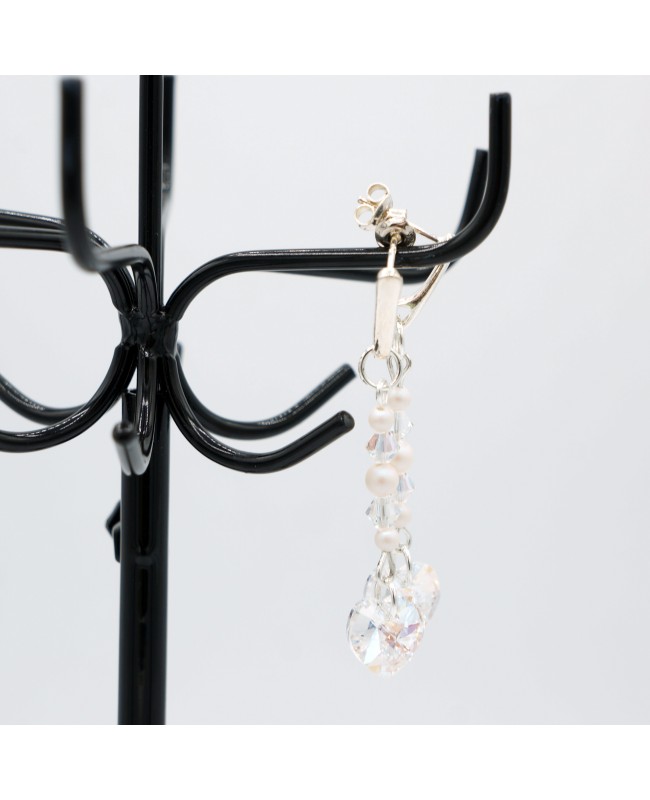 Ces boucles d'oreilles transparentes et blanches, décorées de perles et de cœurs en cristal, sont fixées sur un support argenté. Leur longueur totale est de 5,3 cm.