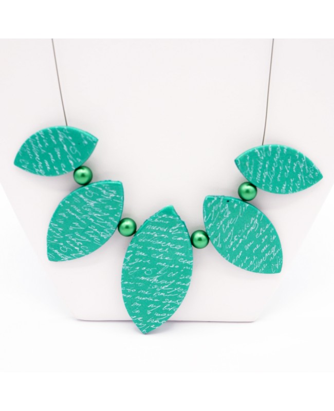 D'une longueur totale de 58 cm, ce collier mi-long se caractérise par ses éléments verts, aux motifs traditionnels et originaux et à ses perles vertes. Sur une base verte avec des reflets métalliques, l'écriture blanche manuscrite apportent un effet original et moderne.