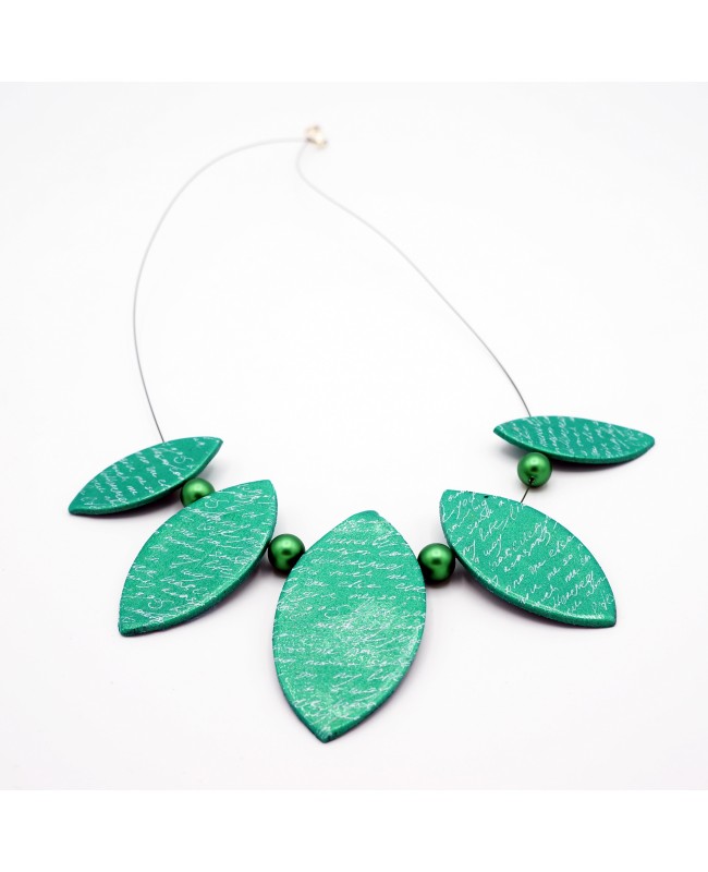 Sur une base en argile polymère verte aux reflets métalliques, des motifs inspirés d'une écriture manuscrite ajoutent une touche de mystère et d’authenticité. Chaque lentille est sublimée par de délicates perles satinées vertes, qui illuminent l’ensemble tout en apportant une touche d’élégance. Ce bijou est monté sur un fil câblé vert et se termine avec un fermoir en métal argenté, pour un rendu résolument chic et moderne.