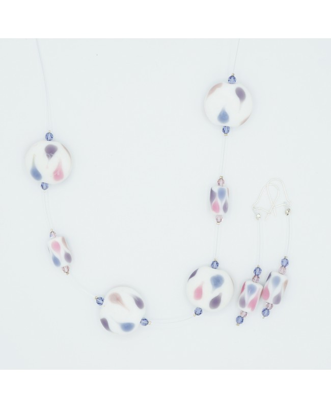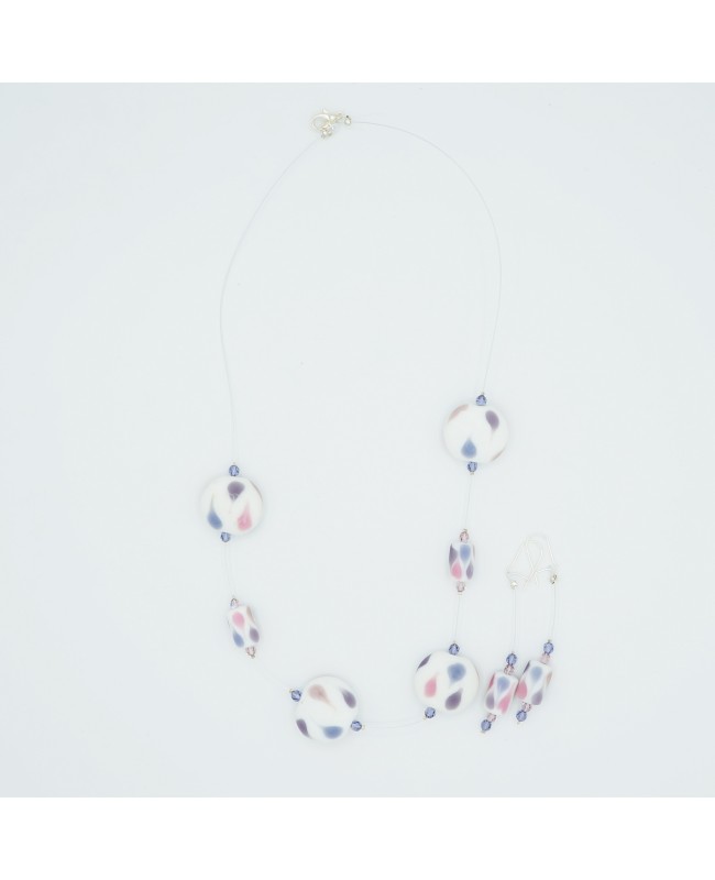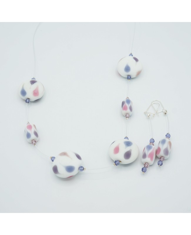 Cet ensemble de bijoux fantaisie, composé d'un collier et de boucles d'oreilles assorties, allie élégance et délicatesse grâce à ses perles en verre mat et en cristal dans des tons pastel de blanc, bleu, rose et violet.