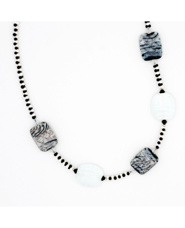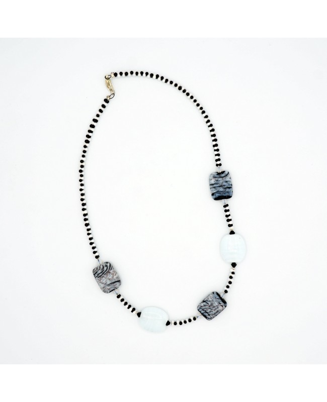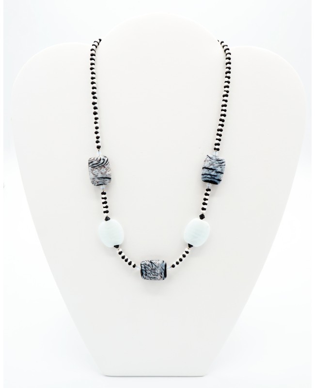 Sous ses faux airs classiques, ce collier est une pièce unique qui a été réalisée dans notre atelier. Les 5 perles principales sont en verre. Elles sont entourées par des perles en cristal de forme toupies. Enfin, le collier est constitué de perles de rocailles noires et blanches et qui ont une forme de papillon. Elles s'emboîtent donc parfaitement pour donner un aspect tout en relief qui apporte de l'originalité à l'ensemble.