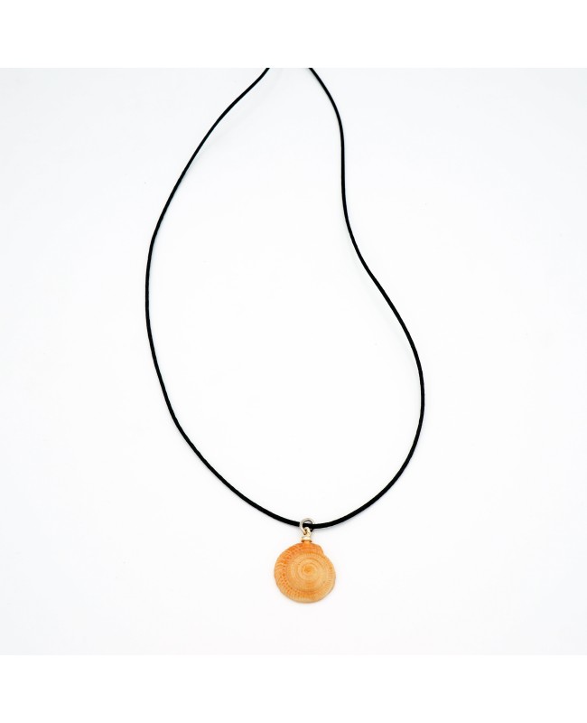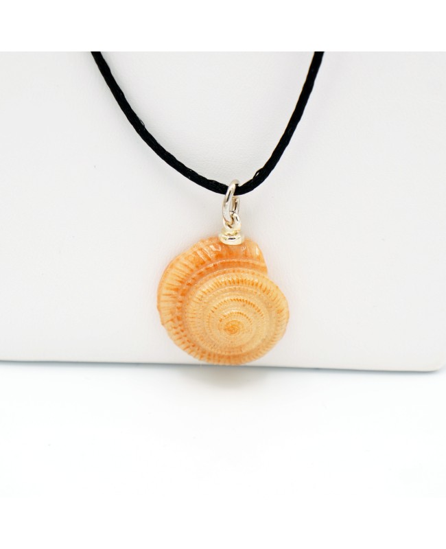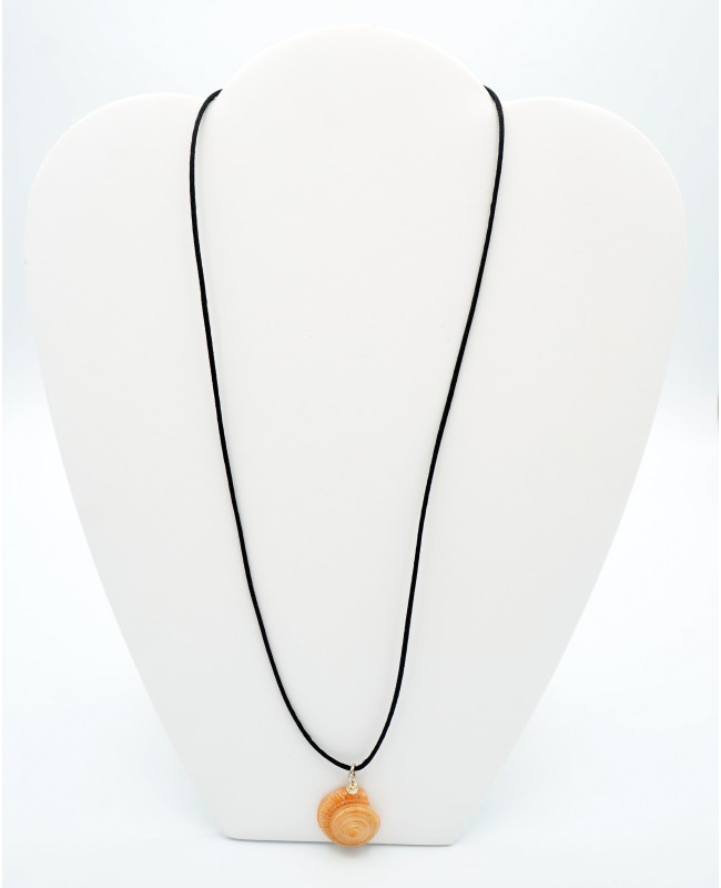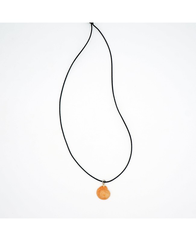 Un petit air de vacances souffle sur notre site avec ce collier en forme de coquillage. Conçu en argile polymère, il ressemble beaucoup a un vrai escargot mais sans sa fragilité. Il est accompagné d'un fil satiné noir qui mesure 62 cm et se termine par un nœuds.