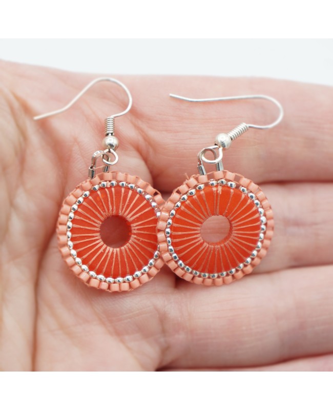 Elles sortent tout droit de notre atelier et ces boucles d'oreilles saumon n'attendent que vous pour briller de mille éclats au coeur de l'été. D'une longueur totale de 4 cm, elles sont constituées de perles et d'un disque central en acrylique.