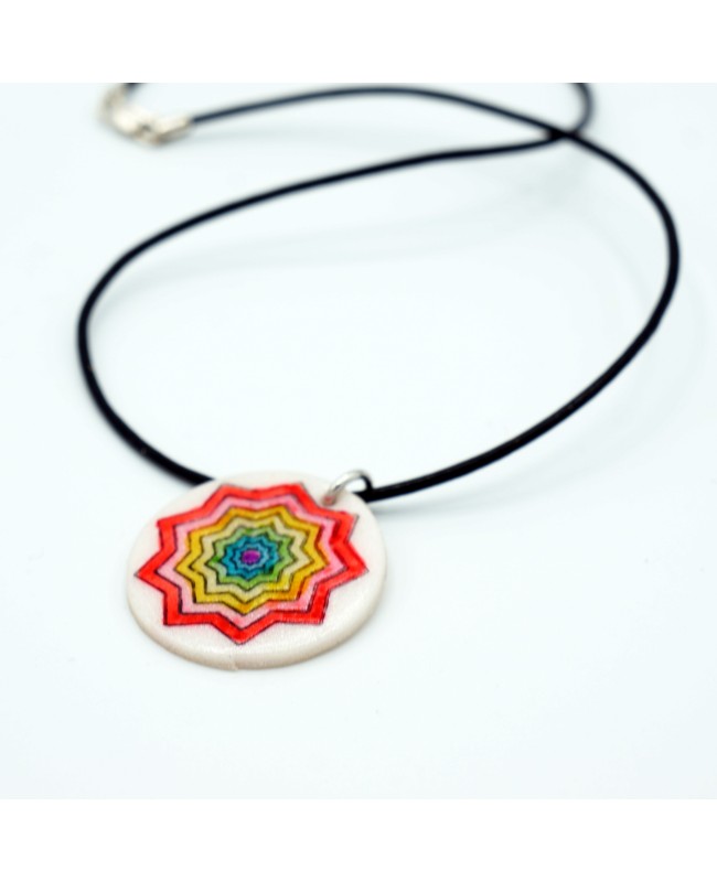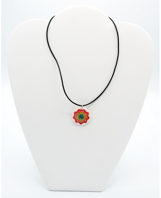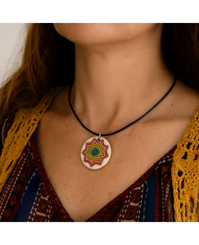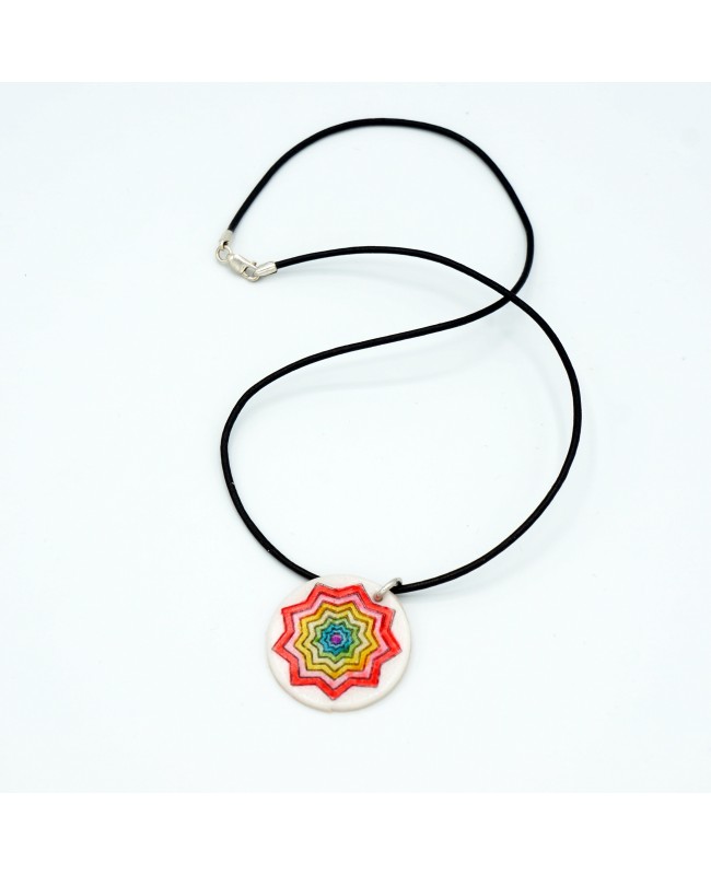 Ce collier ras-le-cou est orné d’un pendentif rond décoré d’une étoile multicolore. Chaque pièce est fabriquée artisanalement, ce qui en fait un bijou unique.