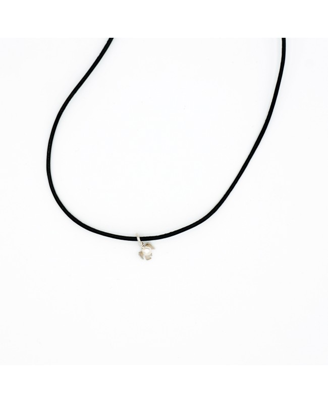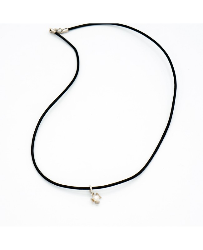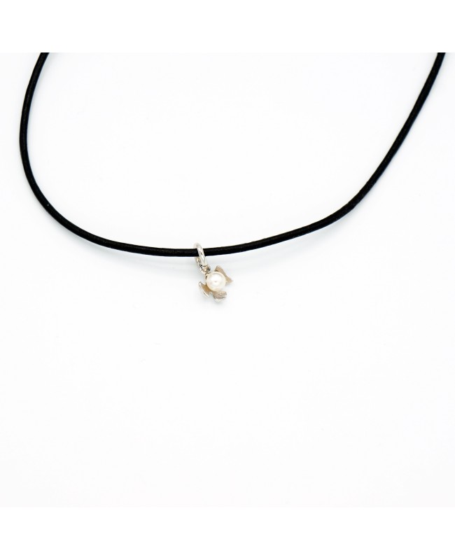 Ce collier ras-du-cou met en avant un mini pendentif avec une perle nacrée blanche nichée dans une corolle en métal argenté. Le tout est suspendu à un cordon en cuir noir de 40 cm. Discret mais lumineux, il capte la lumière sans en faire trop et souligne la ligne du cou avec simplicité.