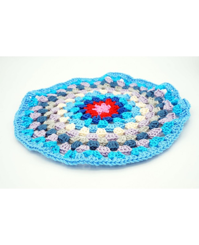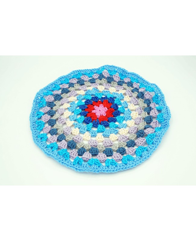 Apportez une touche artisanale à votre déco avec ce napperon rond en crochet, dominé par de belles nuances de bleu. Entièrement fait main en coton naturel, il ajoute élégance et douceur à votre table ou votre buffet.