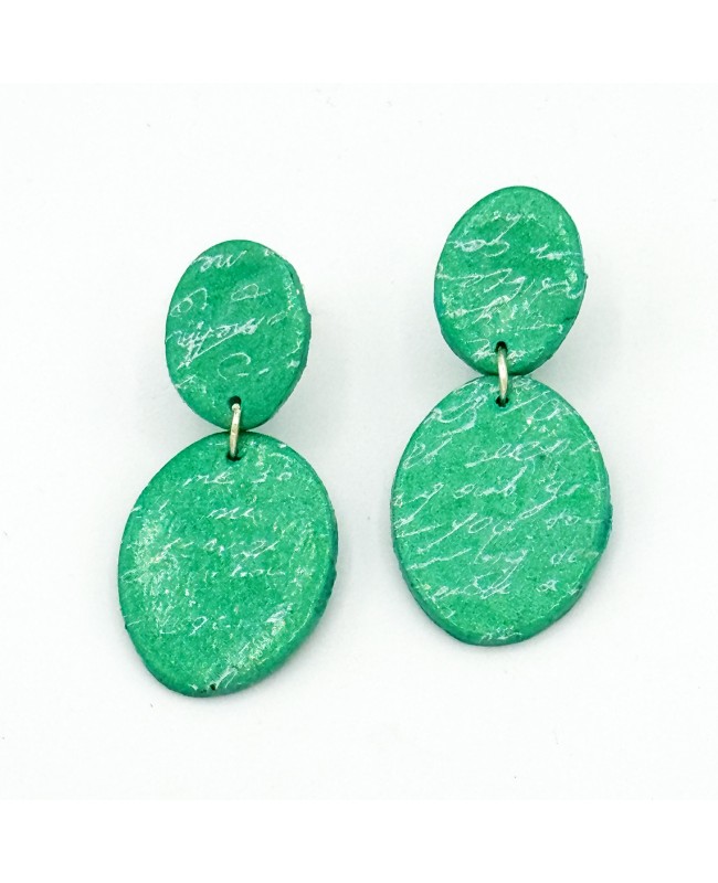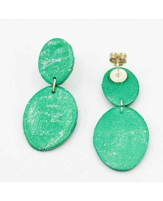 La peinture acrylique, appliquée à la main, crée un effet “écriture manuscrite”, comme de délicates écritures anciennes posées sur la surface. Résultat : chaque paire est unique, avec ses propres nuances et tracés, pour un bijou qui ne ressemble à aucun autre.