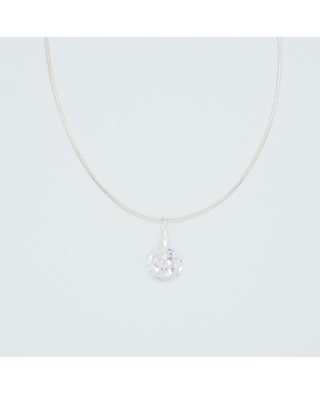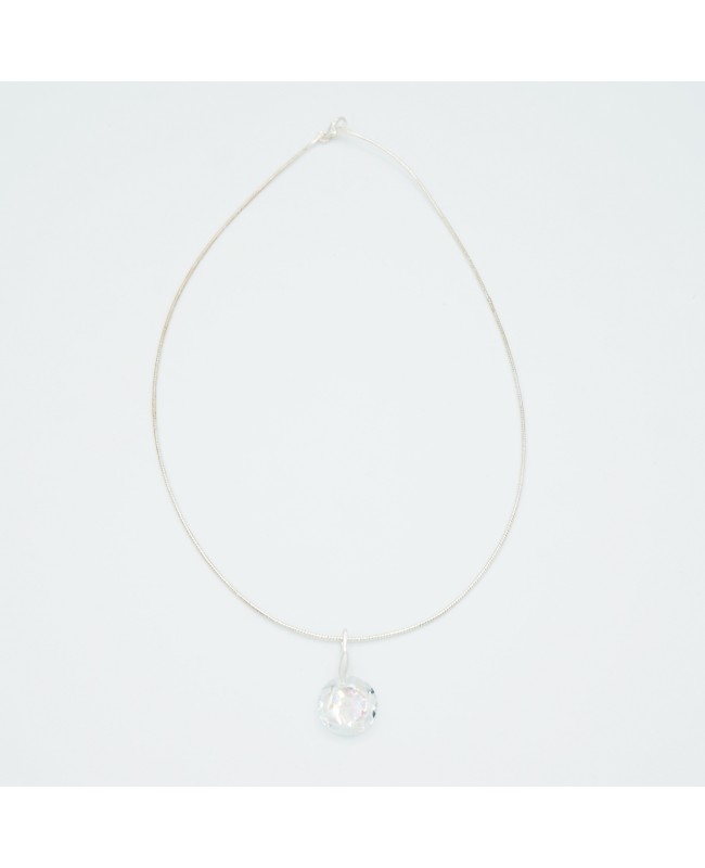 Ce collier se compose d’un pendentif rond en cristal autrichien transparent, suspendu à une bélière en argent. Il est monté sur un cordon fin en acier inoxydable de 40 cm, idéal pour un joli porté ras-du-cou.