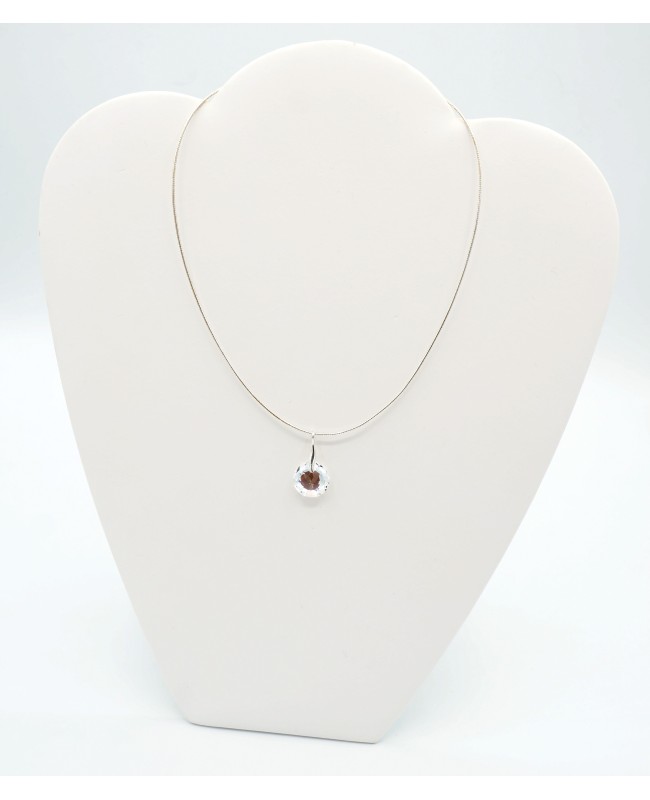 Son cristal de 1,5 cm de diamètre reste discret tout en attirant la lumière. Avec sa hauteur totale de 2,5 cm, bélière comprise, il habille le cou avec finesse et simplicité.