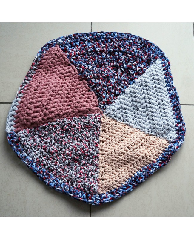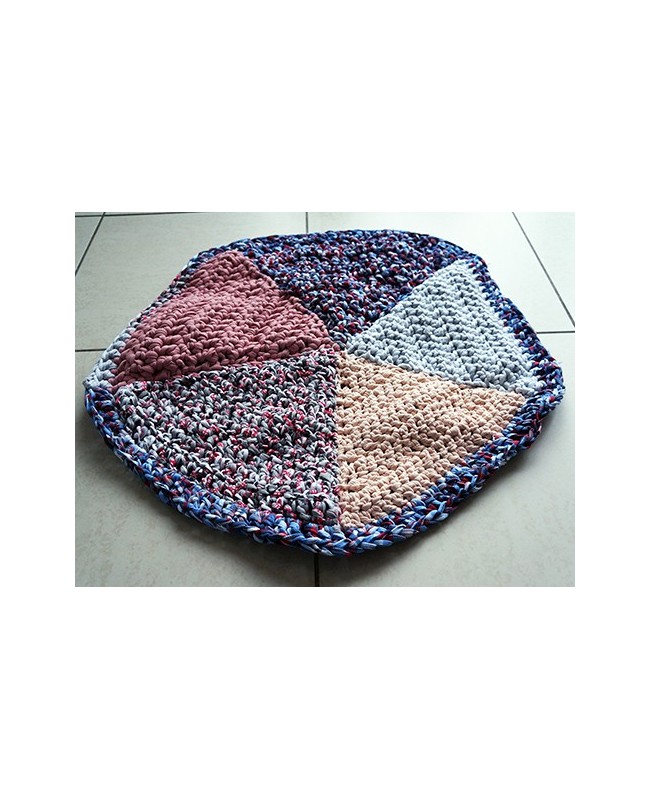 Laissez-vous séduire par ce tapis rond crocheté à la main, composé de nuances de bleu, rose, gris et beige. Avec son diamètre de 60 cm et son design graphique en plusieurs quartiers, il apporte une note douce, artisanale et décorative à votre intérieur.