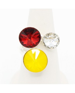 De la classe et de l'élégance avec cette bague ajustable constituée d'un trio de cristaux de swarovski. Jaune, rouge et blanc, ces cristaux ont un diamètre légèrement différent et le support de la bague est en argent.